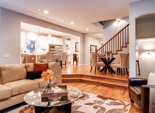 % b7 K+ y; ^( D: G W一个大空间内要划分功能性分区,可以采用"硬性区分"和 "软性划分"两种办法。 软性划分--"暗示法"塑造空间