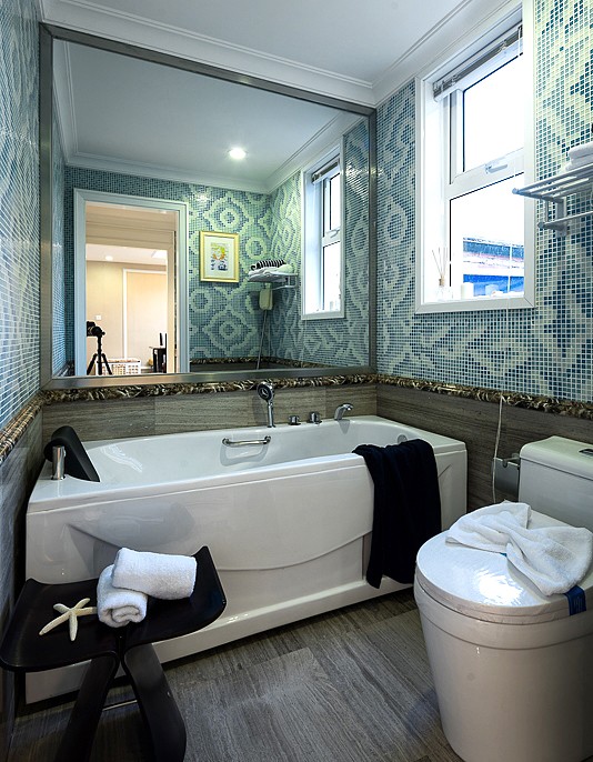 ' w& D3 w( x7 M, |2 q' |7 z爆款四:马赛克卫浴浴室装饰使用马赛克是非常多的,因马赛克特有的靓丽色彩,可以重点突出浴室某个地方,但浴室马赛克装饰需要讲究技巧的。不同马赛克的拼接,呈现出独特的高品质家居生活。0 L N( j. s# ]0 \6 U L
