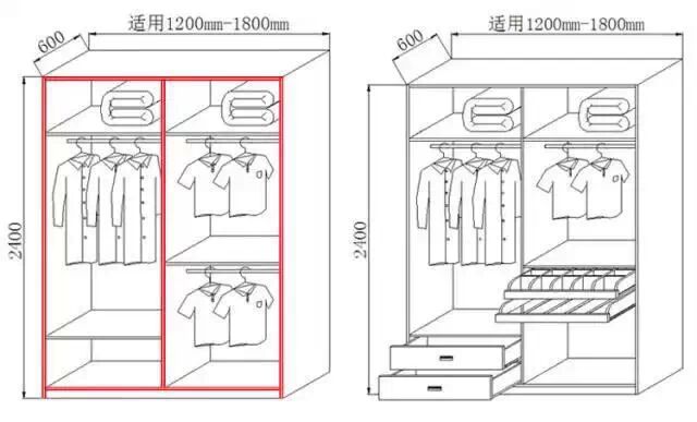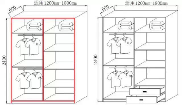 至于叠放衣物的柜体,以衣物折叠后的宽度来看,柜体设计时宽度在330mm~400mm之间、高度不低于350mm;