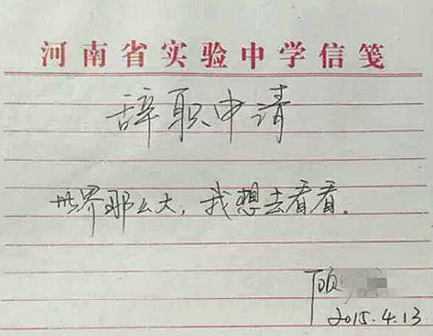 最近,河南一名女老师简短的辞职信轰动了网络,她是这样写的:世界那么大,我想去看看。多么的文艺又有号召力!不过,大家还是冷静冷静吧,人生真要有那么简单,谁还每天那么苦为生活奔波?看完世界,你还是得回来工作!