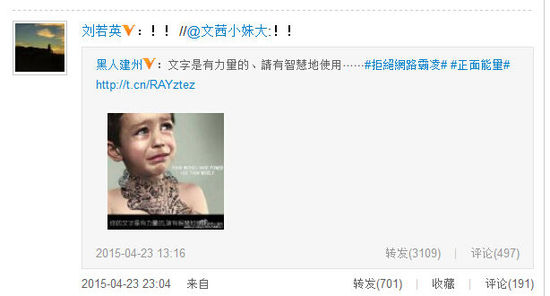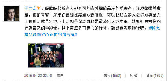 22日,台湾24岁模特杨又颖在家中轻生,留下的遗书中提及在工作上遭到霸凌,不堪网络攻击。4月23日,黑人陈建州、杨丞琳、王力宏等都通过微博呼吁拒绝网络语言暴力。