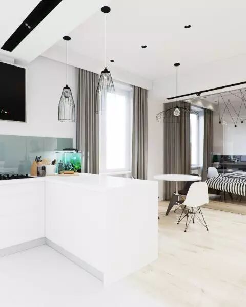 / l3 J! I2 E* X. {9 n/ o二:设计师Mod DesignMod Design是一家专业的设计工作室,这个单间相对比较宽敞,有50平米,大家已经见过很多简约装饰的案例,就应该知道一个家庭不应有太多的装饰而影响整体效果,经典的黑白元素以及美丽的木地板,这个单间绝对的现代。