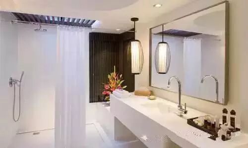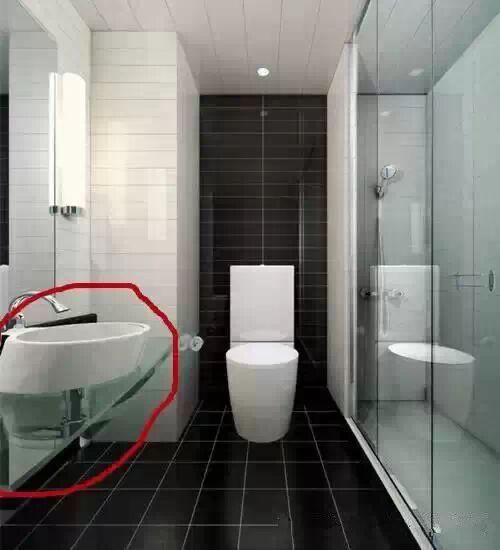 强迫症的朋友卫生间地面避免选择白色和黑色,白色和黑色都是最不耐脏的颜色。卫生间毛发比较多,掉在白色地板上清清楚楚,而黑色上的脚印特别明显。另外第二幅图中画红圈的玻璃台面也是特别难打理的。