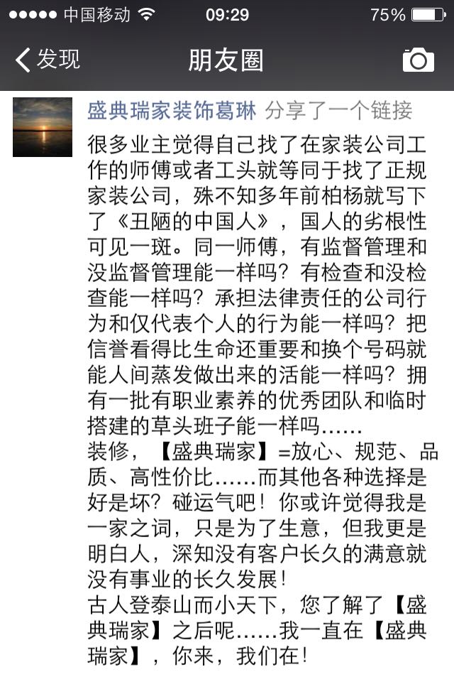 盛典瑞家装饰市场部经理葛琳,从事家装行业10余年,积累了丰富的经验。很多业主因为关注她的微信,最后成为了盛典瑞家的客户,因为她的微信里没有赤裸裸的营销,都是站在朋友立场的推心置腹,剖析真实的事例,讲解从业的切身经验。今天清晨(发布时间06:06)看到她发布的一则微信,小编深感认同,特拿来与亲们分享!