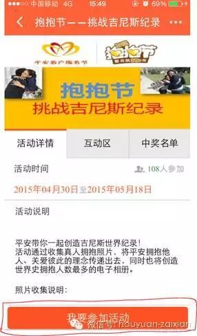 四、报名方式 登陆“平安人寿”APP,点击“活动”模块,下拉进入“抱抱节——挑战吉尼斯纪录”活动,点击“我要参加活动”,并在互动区上传您的抱抱照。