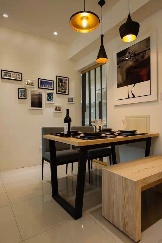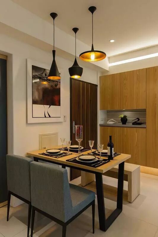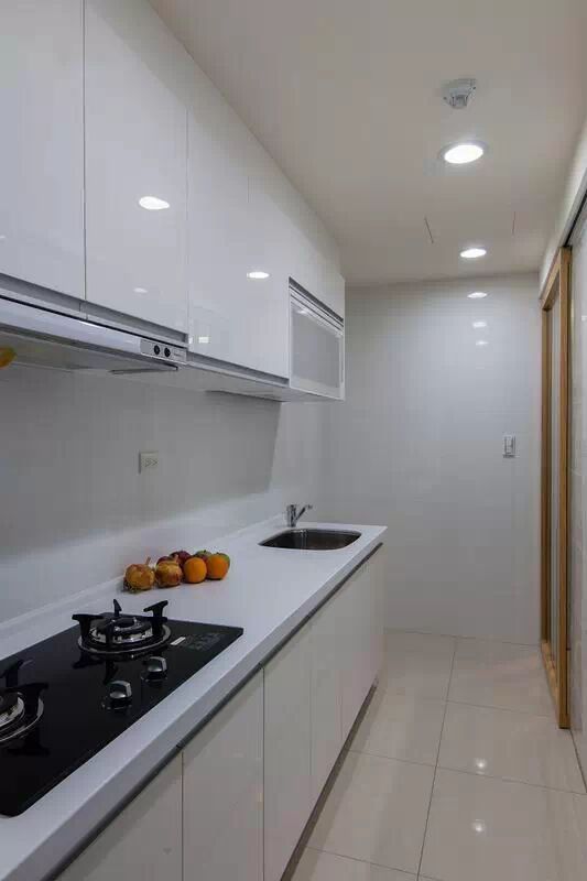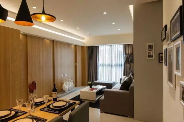 M U' ~! J7 y- f0 ?两个背景墙,电视背景墙部分用来通体的木饰面,沙发背景墙用的是涂料和照片墙相结合。 餐厅很紧凑的选择了一个地方,旁边就是门,墙边是鞋柜和装饰柜,整个柜体也是和电视背景墙一样用木饰面做的装饰面。 餐厅部分用了玻璃移门让空间能够更通透一些,墙面空白部分都有装饰画做了装饰填充。 厨房整体白色调,更显简洁清爽。