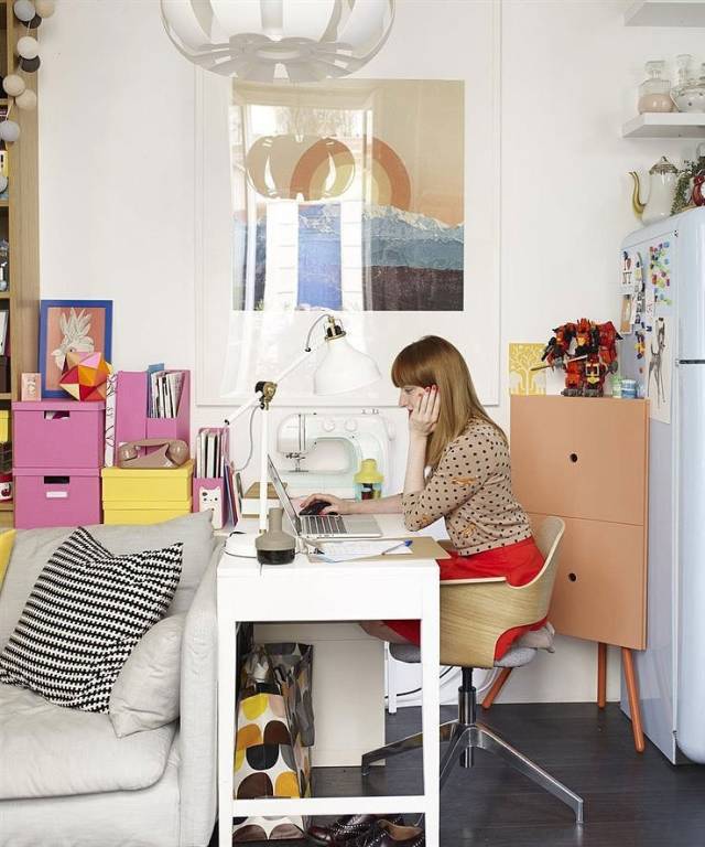 & T3 p! i( H# y5 ]# J% f: y& m) zEleonore的做法是在客厅和厨房之间加一个开放式的工作区,因为要在节省空间的同时还要保证一定的功能性和储物能力,所以IKEA的产品会是不错的选择,例如图中适合放在转角的这个柜子。另外有一点需要注意,因为是在两个区域中加设的,所以其中占最多位置的书桌最好匹配基础色,这样才不会显得拥挤,而且视觉上也更加流畅。