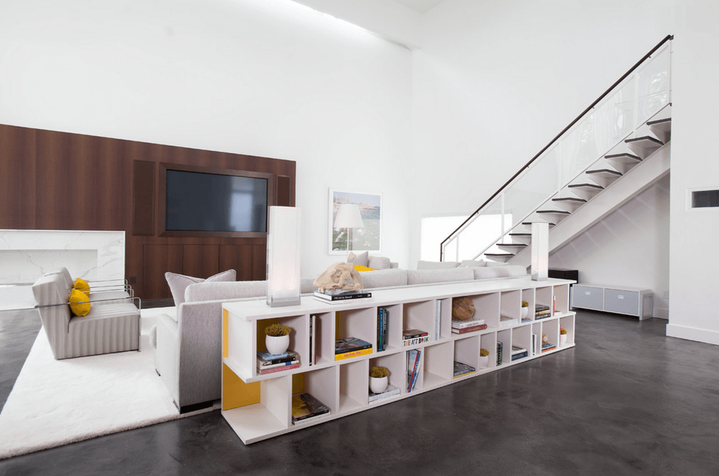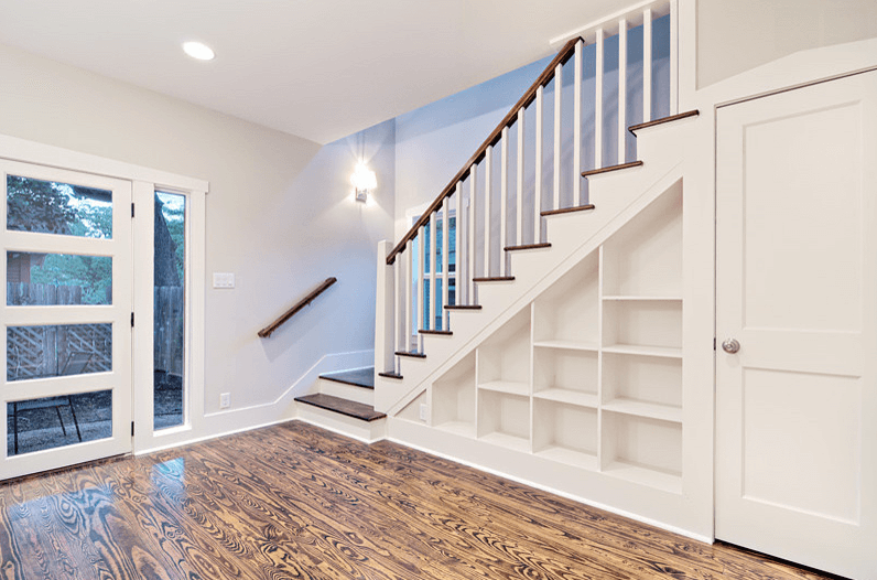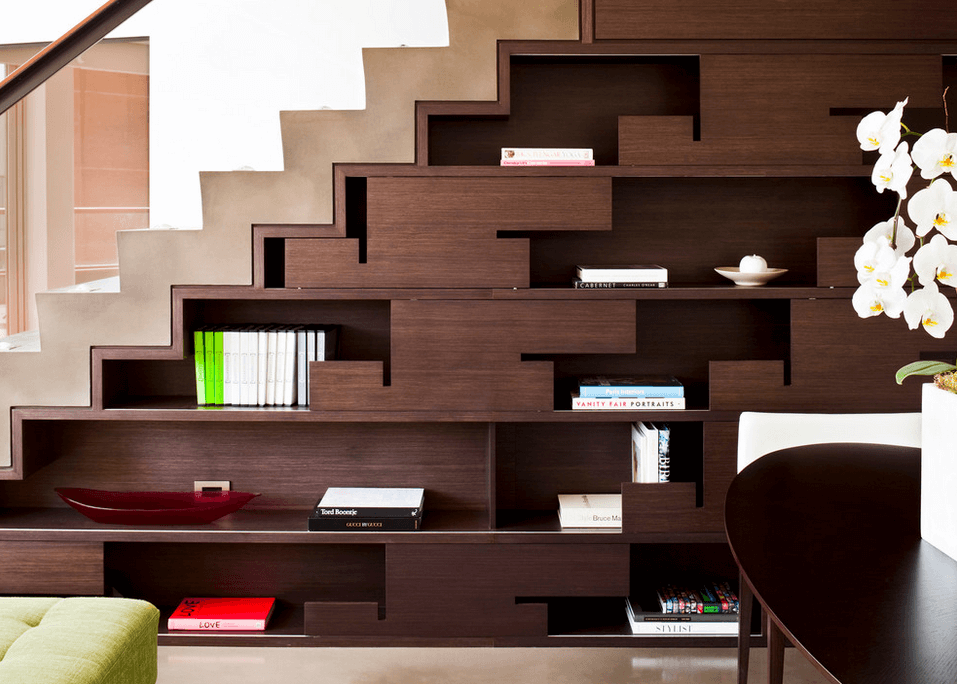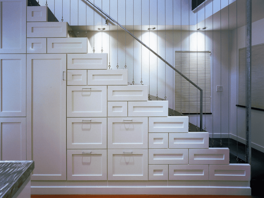 7 U; W+ n! C E& m楼梯下的边边角角 楼梯下的空间有两个巧妙的收纳技巧,❶楼梯本身,比如收纳功能的抽屉,但这个选择比较花钱。❷利用楼梯的角落空间或尴尬的空间来定制自己的存储。