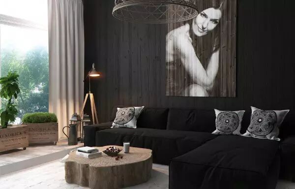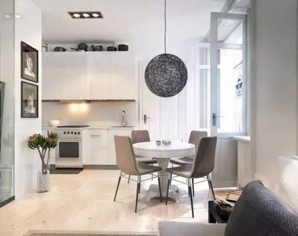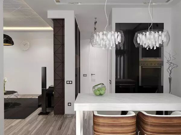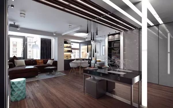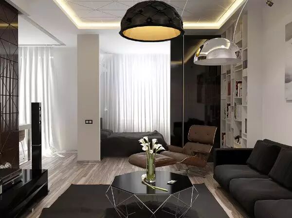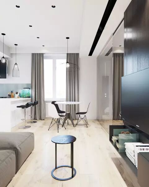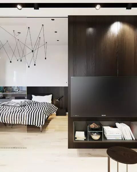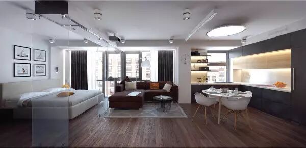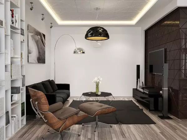 一个家庭不应有太多的装饰而影响整体效果,经典的黑白元素以及美丽的木地板,会让单间充满现代感。图中的这个单间相对比较宽敞,有50平米,灯饰、沙发、小配饰,无不给人感觉这个单间绝对的现代。