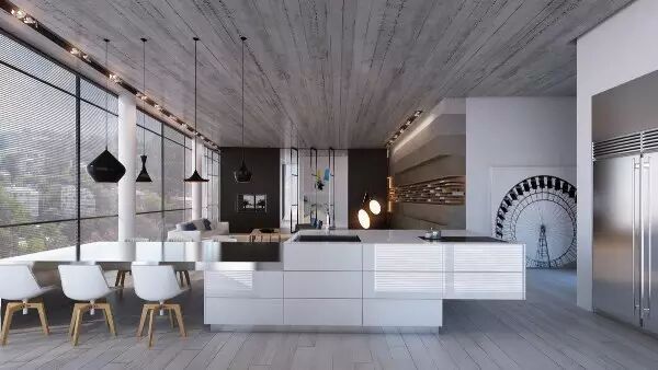 设计师这个设计十分奔放大胆,卧室与客厅之间索性就没有墙壁作为隔断,自然的地板,温馨的餐厅,黑色亚光厨房,整个空间十分开放,能够让人一眼望穿。现代感你敢说没有吗? , J& \$ e9 |- i8 s% a; y& G