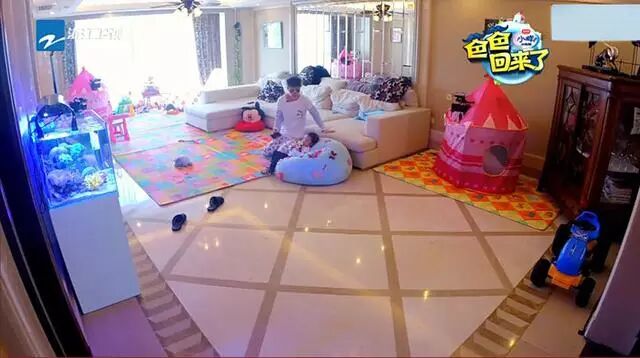 客厅 这一季中,贾乃亮家的家居搭配明显有了很大改进,卡通数字和图案的垫子加上两个粉红色的小帐篷看起来趣味十足,米白色简约布艺沙发和沙发后镜面设计让家更显简洁大气,客厅放一个鱼缸,给家带来生机。