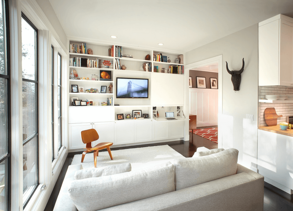 智能的家具 多功能家具一举多得,垫一块毯子它就是沙发了,在挑几个不错的抱枕它就是床了,这个好主意都不用在小空间里,小编无话可说啦。 八面玲珑的墙 不是每位都拥有超大的别墅,我们挤在几十平米的房子里,地面被家具占据很大部分空间,墙面是最好的选择来创建自己的配置。比如一面墙都是收纳空间,或者添加一些挂钩、挂货架,又或者像《虎妈猫爸》那样,自行车挂起来,其实有很多方法的。 + g/ j/ C, b: {3 s/ e