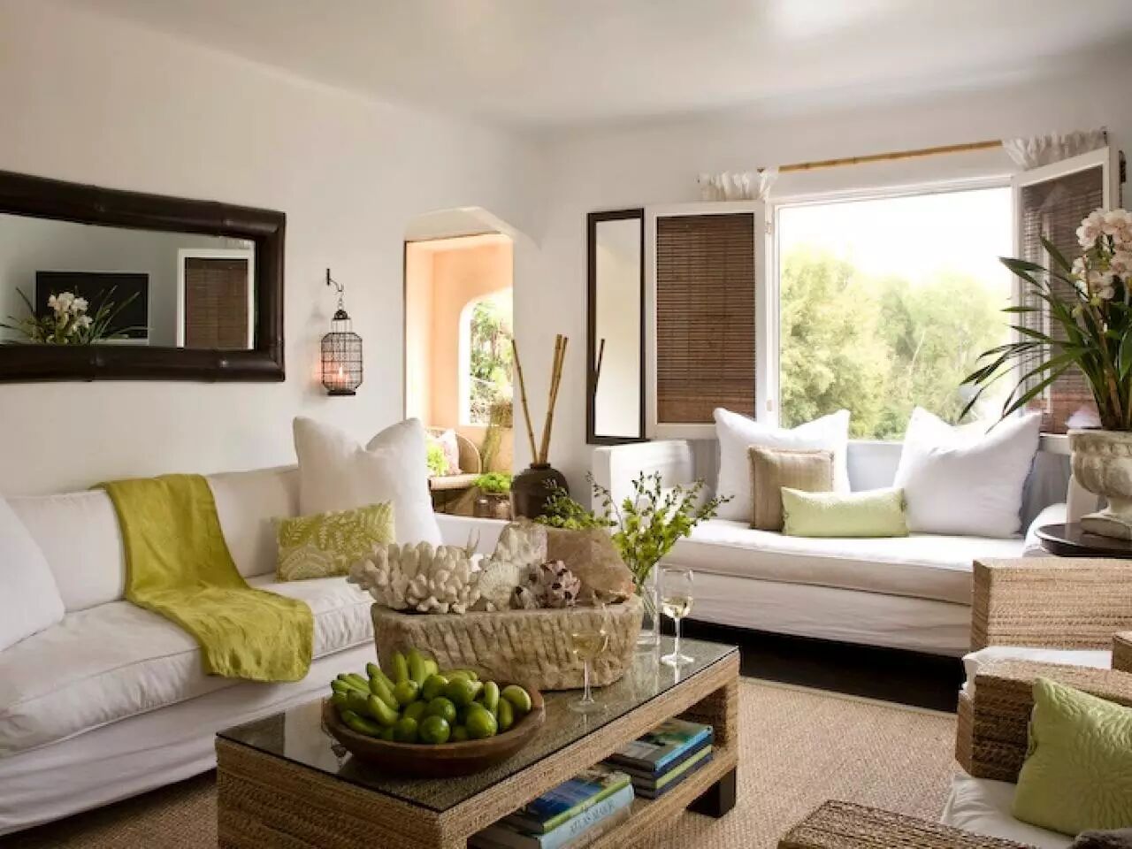 海洋的蓝色和沙丘的草绿色创造出迷人的海滨小屋,随和而舒服,让人联想到海岸。想要模仿这种空间的格调,可以用舒缓的色调、与海洋有关的配件,比如沙滩玻璃和贝壳,或者是海草家具来装饰。