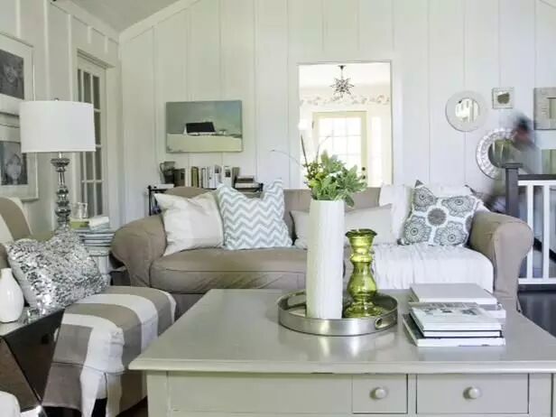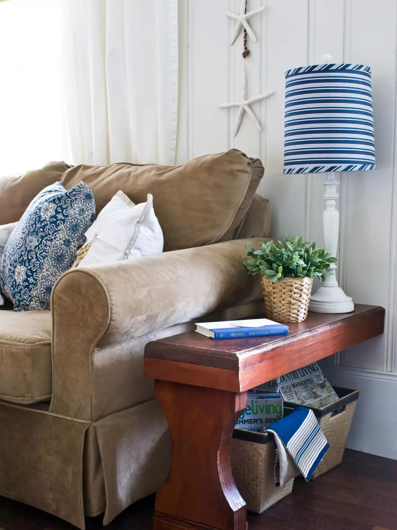 小客厅也可以很简单地通过细节装饰达到沿海风格的目的,比如可以挂海星,由自然而激发灵感做成的灯罩和绳子枕头流苏。为了增加微妙的海洋感觉,设计师蕾拉帕默加入了活泼的白色布料和青花图案的抱枕。