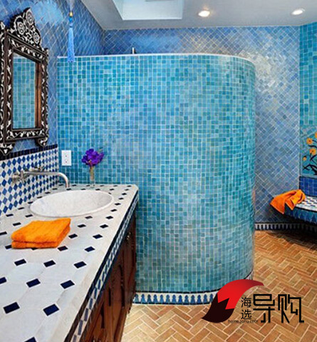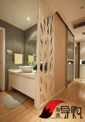 可以利用半截墙面将卫浴间分离出干爽区域,放置盥洗台或一些木质搁物架等小型浴室家具,而湿区部分则包括马桶和浴缸。在盥洗台前的地面也应保持干净,可以铺设吸水地毯。