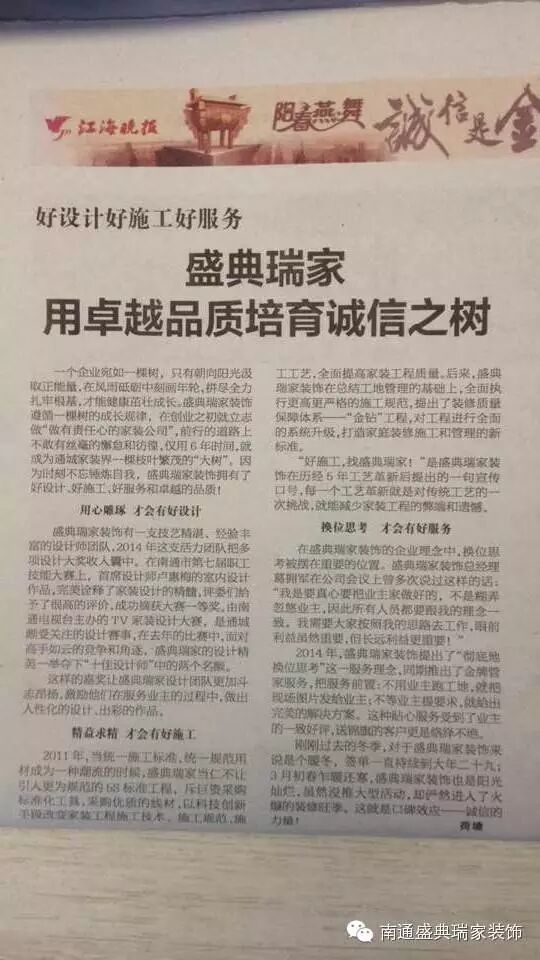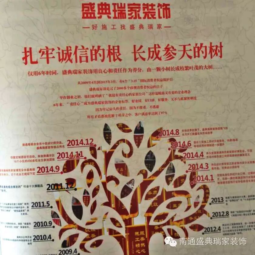 盛典瑞家已成长为一棵枝叶繁茂的树让盛典瑞家的家人们颇为骄傲的是,经过7年的成长,我们一路汲取阳光,储备正能量,扎下坚实的根基,拥有无与伦比的好口碑。我们有着一支优秀的设计师队伍,他们平均工作年限在8年以上,专业且异常敬业;我们有着近20支施工队伍,60多个施工班组,项目经理和工人95%以上是南通本地人,淳朴且技艺精湛,均在公司范围内缴纳保险。我们的施工和服务广受业主的好评,时常收到业主表示嘉奖的锦旗。