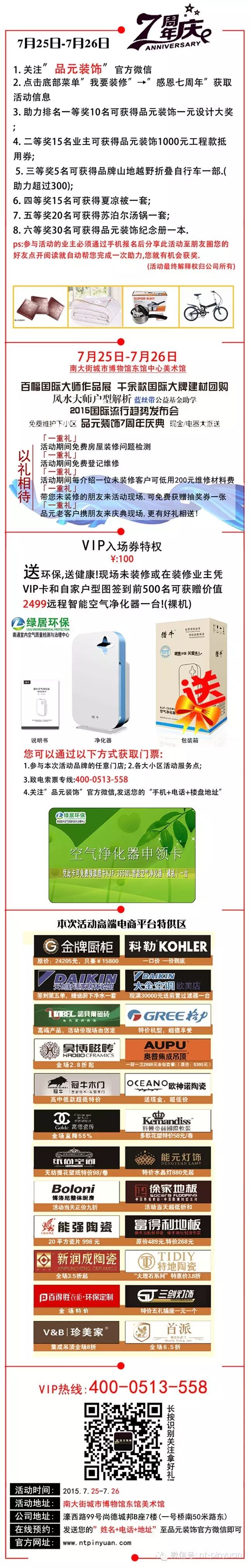 品元装饰辉煌七周年庆大型设计建材乐购峰会 倒计时7天! 活动时间:2015.7.25-26 活动地点:南大街城市博物馆东馆中心美术管 在线预约: 预约热线:13813711964