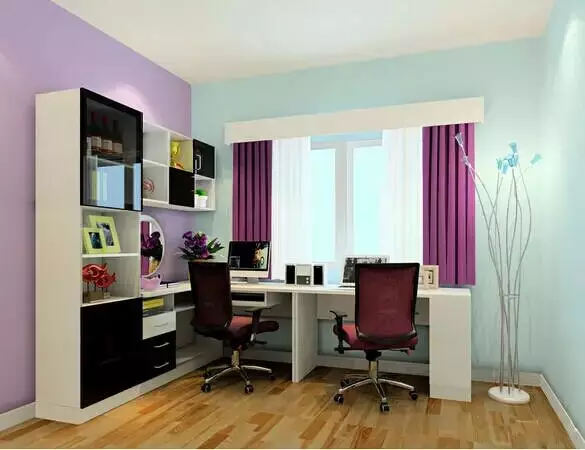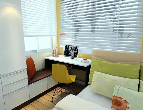 飘窗处做一个转角书桌柜,简单又实用。 4 p W& Q. C6 q# j. ^& C