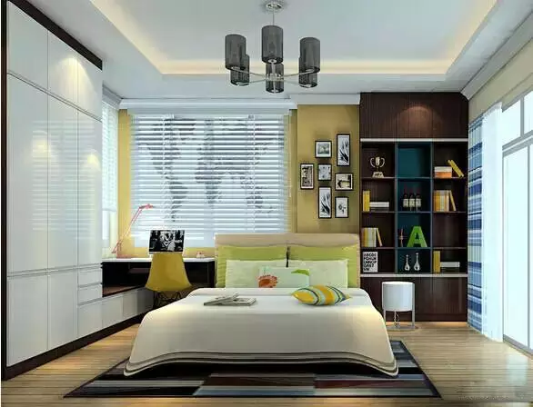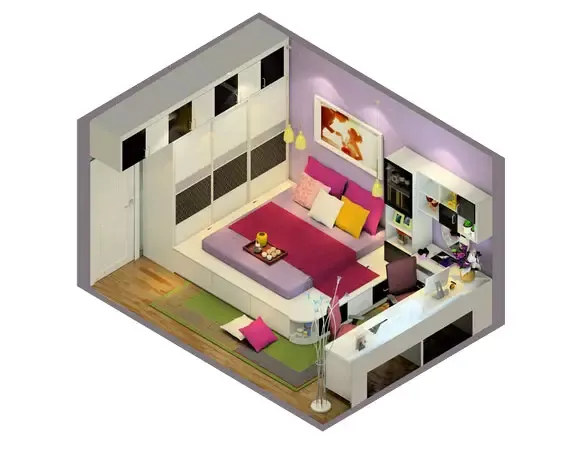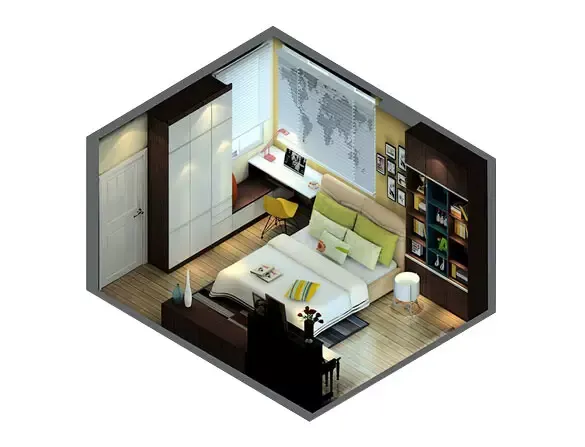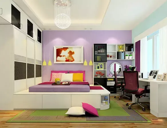 & P( C5 C; Y4 O. c. w* p b* [9 F房间另一侧做一个转角矮柜,做工精细,是女生最喜欢的闺房。& p# v8 D2 H `