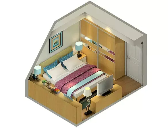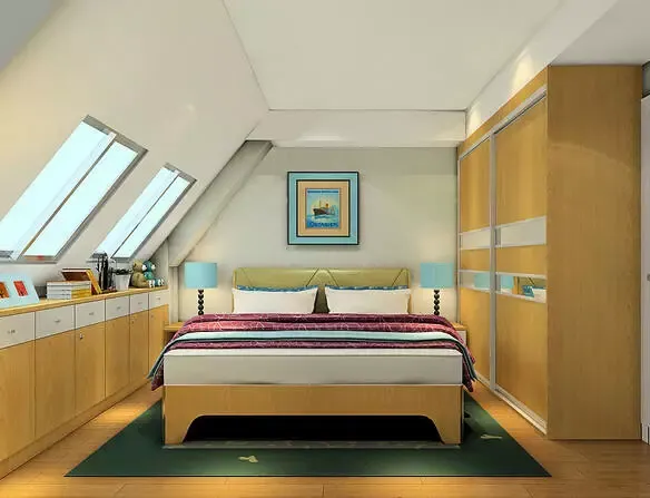 & X! J/ E% o( s% G2 Q北美风情 这个卧室选择了原木色的家具,给人一种贴近自然的生活状态。阁楼里的格局比较特别,定制家具可以帮你科学规划空间。: `# C$ ^" ?/ H9 L4 i