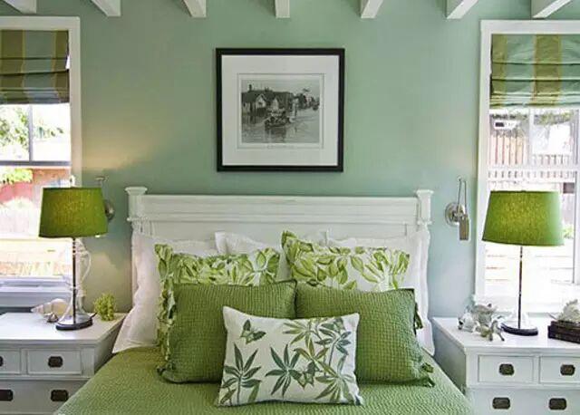 / ^* _- t3 v9 g: f5 t* L清新绿色青绿色的台灯、床单和竹子印花抱枕,给人清新的美感。; O4 w' v! ^' q' s" k) U