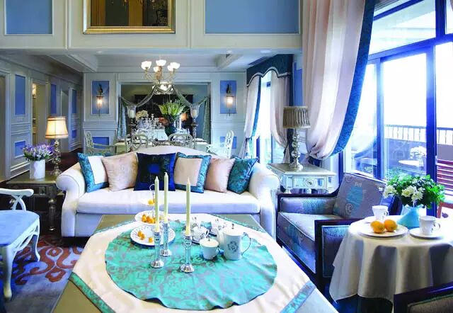 ! G. L0 ]: A$ _. p蓝色地中海以蓝白色调为主,风格大气怡人,家具搭配上避免琐碎,显得大方、自然。; m( w+ P5 [; n" Q/ q9 w4 x$ j+ B