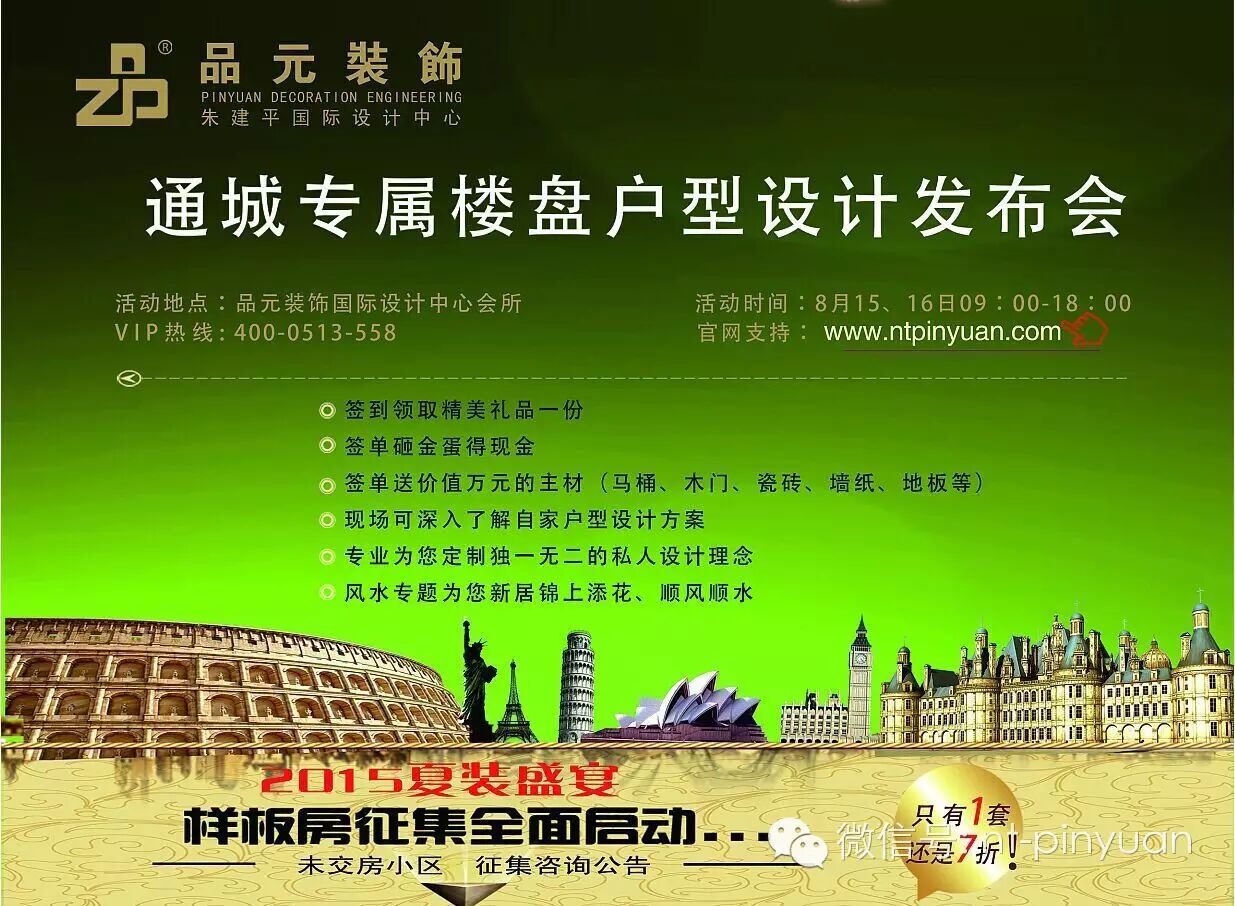 >>活动详情<< 【主办单位】:品元装饰工程有限公司 【活动时间】:2015年8月15-8月16日9:00-18:00 【活动地点】:品元装饰国际设计中心濠西路99号尚德城邦B座7楼 【活动主题】:通城专属楼盘户型设计发布会 【活动对象】:所有通城业主 【预约热线】:13813711964 【在线预约】: 【活动优惠】:每个未在品元装修的小区征集一套样板房7折 1来就送精美礼品一份 2签单砸金蛋得现金大奖 3签单送主材价值万元!(马桶,木门,瓷砖,墙纸,地板等) 4现场可深入了解自家户型设计方案 5专业为您定制独一无二的私人设计理念 6风水专题为您新居锦上添花,顺风顺水