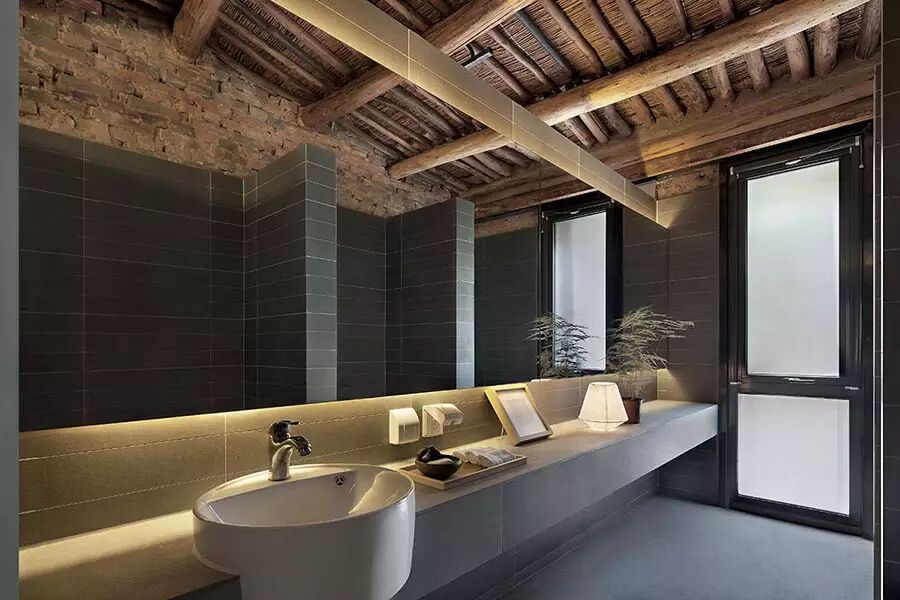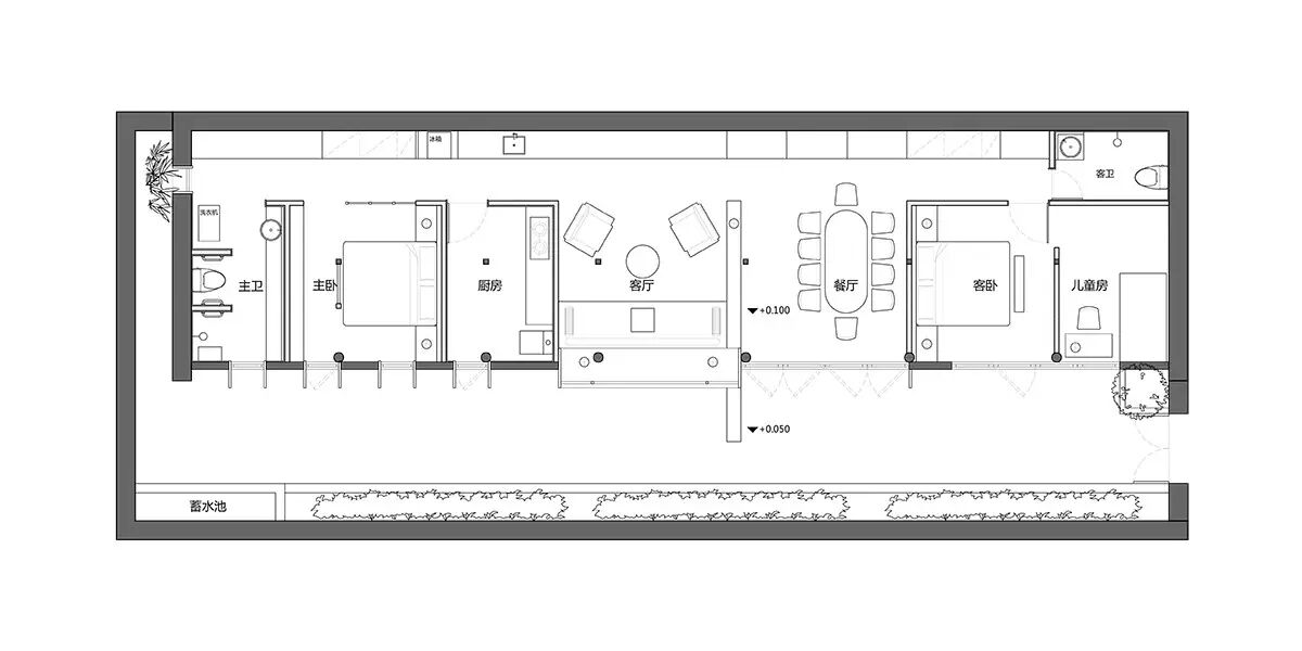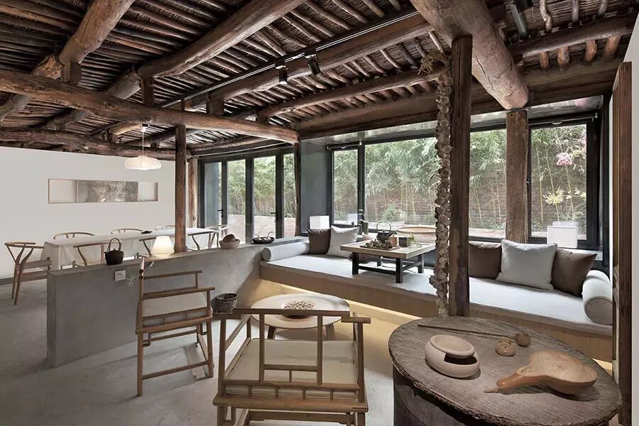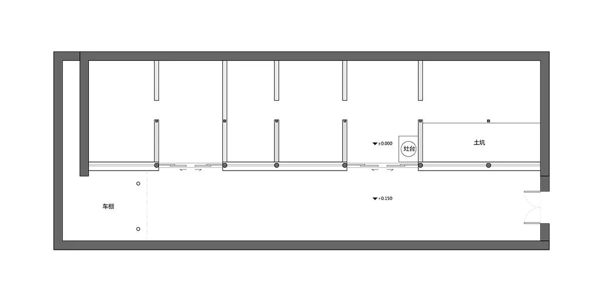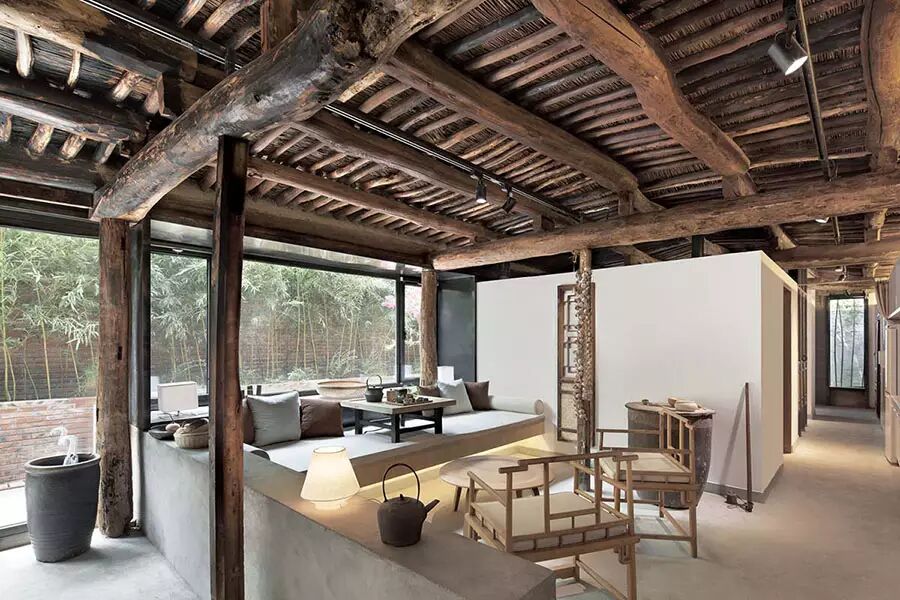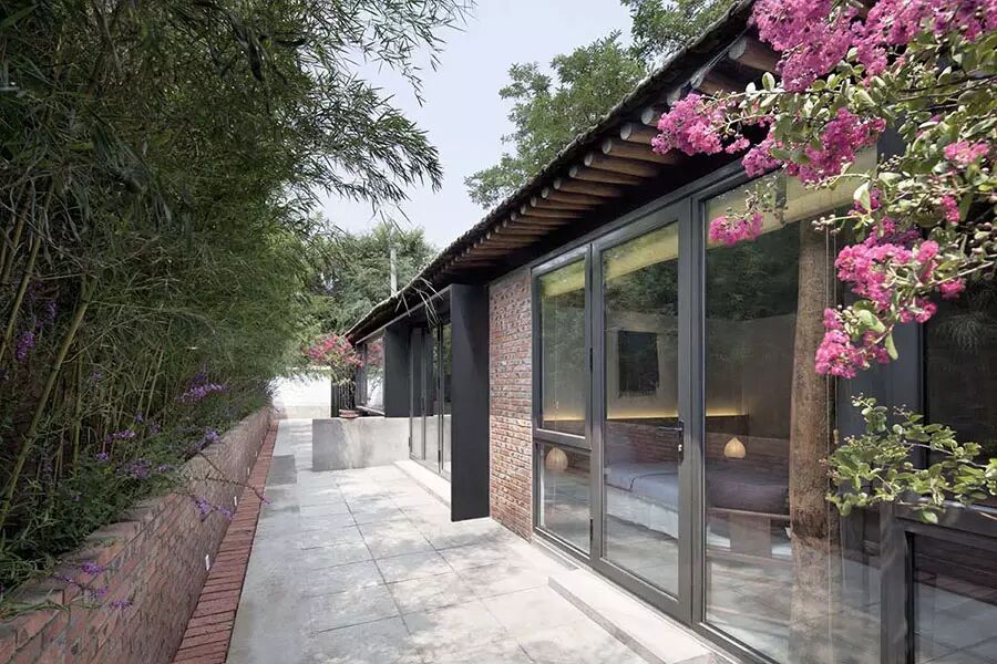 ; y% y6 Q7 q/ e1 d1 K 针对水的问题,设计师将排水与节水一并考虑。一方面,提升了室内地面,调整了室外地面并重新铺设了排水沟。另一方面,在院子的端头修建了蓄水池,将院子两侧屋顶的雨水收集起来循环利用。这不仅是达到了节水的目的,同时也极大的减少了强降雨时院中的短时汇水量,使得院中的雨水可以及时排净。在晚间停水时,收集的雨水可以做为冲厕用水的补充水源。 在功能布局上,经过与住户的仔细沟通,在充分的了解了住户生活习惯的基础上,我们对原有的布局做出了很大的调整。 首先,我们将原来停放在院子端头的农用三轮车移至大门外停放,使得院子可以被重新加以利用。沿墙的绿化为室内空间创造出了可视的景观。由于当地有不能在北墙开窗的习俗,我们将所有的收纳功能都集中到了北墙一侧,所有的居住功能都安排在了南边采光更为充足的一侧。 鉴于房屋东西狭长的特点,中间的部分安排为公共的开放空间,长辈的卧室和客人的卧室这些较为私密的空间则被分置于东西两侧,避免相互之间的干扰。由于地面高度的提升,梁下的净空高度只剩下不到2.1米,加上原有的简易的吊顶,十分低矮压抑。我们将原有的吊顶全部拆除,露出了木结构及秸秆铺装的屋顶肌理。在做了简单的清理及维护后,尽量保持了它上面的岁月痕迹。 另外设计师有意将南侧的维护结构向外推出了约50公分,将承重用的木柱保护在了室内免受室外风雨的侵袭,同时木结构柱也得以单独暴露在室内空间中成为了一种自然的装饰。 在场地勘测的过程中,我们发现现有房屋同西侧邻居家院墙之间有一道宽约80公分的狭长走道。于是我们在室内走廊尽端的西墙上开了一条景窗,窗外种植的绿竹成了狭长走道的对景,摇曳的竹影也进一步将室内空间同自然环境联系在了一起。 + _1 v6 s, q0 ?' c) |