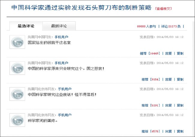 昨天,一篇来自浙江大学、浙江工商大学和中科院理论物理研究所的论文公布在了预印本网站上。根据媒体的宣传,研究者“找到了石头剪刀布的制胜策略”。 自然而然地,很多网友的反应是:“这还需要你研究?” 网友评论截图。图片来源:凤凰网但是只需扫一眼就会发现,研究者不幸又被标题党坑了。他们寻找的不是怎样玩赢剪子包袱锤,而是通过人们在剪子包袱锤里的行为来判断哪一种理论更能预测人类——是传统博弈论的纳什均衡,还是演化博弈论。 因此,我打算从我熟悉的演化博弈论角度来越俎代庖,尝试解读这项研究为什么不是在浪费钱。 为了帮助理解它,我会讲四个故事。这四个故事从易到难,如果你已经对这个领域很熟悉了,可以跳过前面的几个故事。 第一个故事:囚徒困境一个有钱人被发现死于家中。警方抓获了两个犯罪嫌疑人并查获了赃物,但两人辩称说他们只是小偷,进屋时那个人已经死了。没有更多证据,调查陷入僵局。 于是警方把两人分开,分别对他们说: 如果你俩都不认罪,我只能判你盗窃,一年了事;如果你招了他没招,你算作立功,不用坐牢,而他得十五年。如果如果他招了你没招,那反过来。但如果他和你都认了,谋杀罪每人十年。 嫌疑人X心想:如果Y不招,那么我也不招的话会判一年,我招了无罪释放。招了更划算。 而如果Y招了,那我不招的话十五年,招了只有十年。还是招了更划算。 显然我应该招啊。 而嫌疑人Y当然也是这么想的。结果,两人都判了十年。任何一人改策略都只会让自己处境更糟,这便是一个纳什均衡。 可是,如果从整体上看,最好的结果显然是两人都不招,各判一年。 双方都是理性考虑谋求自己的最大利益,结果却是两人都遭遇了坏场景;无论是整体最好场景(各判一年)还是个人最好场景(直接释放)都不可能发生。这就是为何囚徒困境是个“困境”。每个人都很精明,最后怎么弄了这么个烂摊子? 囚徒困境示意图(或者,“收益矩阵”)。图片来源:Encyclopaedia Britannica按照囚徒困境术语,不招的行为算作“合作”(和你的狱友合作,不是和警方合作),而招认的行为算作“背叛”。双方都合作最好,双方都背叛则两败俱伤。按照这个故事,合作根本不可能出现啊。 现实中类似囚徒困境的场景常常出现。但是,更多的结局似乎是合作,而不是背叛。为什么? 可能的原因是,困境不止这一次。 第二个故事:重复囚徒博弈如果嫌疑人X和Y是陌生人,那么两人的下场都是十年。但是他们也许是两肋插刀的好哥们,或者有血亲,或者属于同一个组织——总而言之,用博弈论的术语,他们以前也许打过交道,将来还很可能继续打交道。这时,“合作”就不是什么难以想象的事情了吧。 因此,一位名叫罗伯特·阿克斯罗德的政治学家在上世纪80年代初做了一个名垂青史的实验。他在计算机里摆了一场锦标赛,有很多名虚拟的参赛选手,双方捉对厮杀——哦不,是捉对进行重复囚徒博弈。按照博弈的结果记分,你背叛他合作,则你得5分他得0分,双方都合作各得3分,双方都背叛各得1分。 然后,他向全世界征集策略,每一个得到的策略变成一个参赛选手。提交的策略共有14个,来自经济学、社会学、政治学和数学等等领域,再加上一个“完全随机”的对照策略,共15“人”进行比赛。这里面有些策略极其复杂极其精妙,比如有一个策略用马尔科夫过程为对方的行为建立模型,然后用贝叶斯推断最好的选择。 但是,最后得分最高的竟然是所有提交策略里最简单的一个——“一报还一报”(TFT, tit for tat)。这个策略一共只有两条规则:(1)第一步先合作,(2)从第二步开始,对方上一轮出的是什么,我就出什么。提交这个策略的是维也纳的安纳托·拉伯波特,他写这个策略只用了4行BASIC代码。 阿克斯罗德发表了锦标赛的分析结果,并邀请大家吸取经验教训提交新一轮策略——这次他获得了62个策略,不但有上面提到的领域,还包括了演化生物学、物理学和计算科学等新学科。只有一个人厚颜无耻地原样提交了上次的卫冕冠军,那就是拉伯波特本人。你猜对了。他又一次获得了胜利。 TFT这个“报仇者”成功的秘诀并不复杂。阿克斯罗德说,它有三个要素:它第一轮总是合作,先表示善意;它会惩罚背叛者;如果对方改过自新,它也不会咬住不放。 但是甘地说过:“以眼还眼,举世皆盲。”现实中总会因为各种原因结下仇怨,但我们也没有从此冤冤相报何时了。这又是为什么? 可能是因为,现实本来也和阿克斯罗德的模型有些重大差别。 第三个故事:有突变和自然选择的重复囚徒博弈(1)自然发现了宽恕阿克斯罗德锦标赛有两个重大缺陷。 其一,双方的行为都是完美的,没有误会,没有失误,哪怕不知道对方想什么,至少知道对方做了什么。但现实里多少悲剧源于双方一开始的误会啊!这个重要因素显然不该忽略。 其二,每一个策略的“环境”都是武断决定的。一个策略能否成功,和它身边别的策略如何有很大的关系。假如群体里全都是永远背叛者,那么报仇者完全占不到任何便宜。而阿克斯罗德锦标赛里的参赛选手都是人为提交的,这可不能说是有代表性的样本。 因此,在阿克斯罗德实验的基础上,马丁·诺瓦克制定了一轮新的锦标赛:引入了自然选择。 他不再邀请人类专家设计策略,而是规定了一个大小合适的策略空间,允许策略在里面进行“繁殖”和“突变”。每一轮得分高的策略