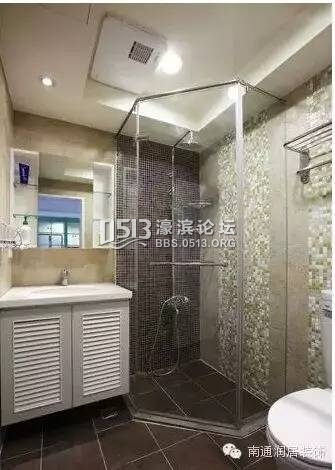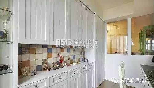 4 X) T9 b0 k$ \卫生间虽然小,装饰元素同样重要,淋浴区的马赛克墙砖充满乡村风味。利用墙角划分出干湿区,白色的收纳柜不仅起到了收纳的作用,还融入了美式风格。