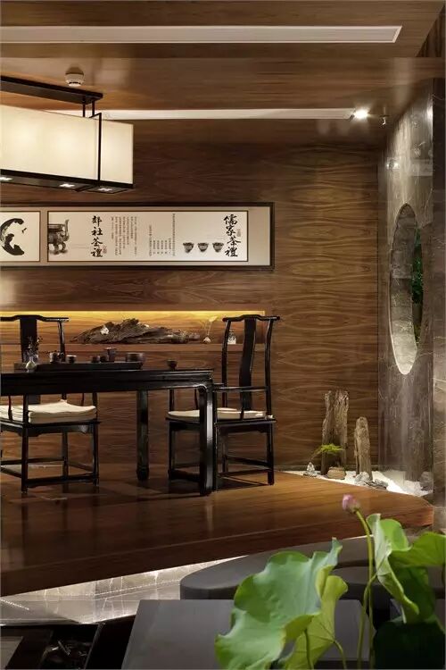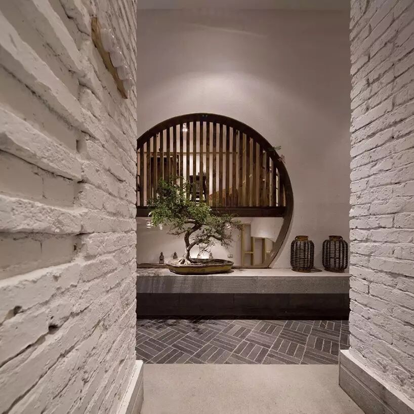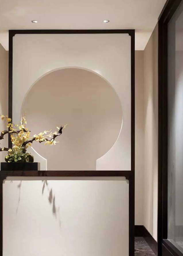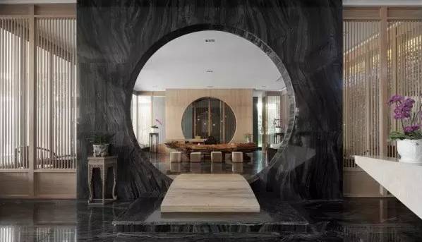 以园林的”窗“元素融入到室内中,空间别具一格,空窗给空间内增加层次和间隔,光影从窗中透过,造成了光与影的对比,疏与密的对比,曲与直的对比,明与暗的对比,使简单的圆图案创造出多层次的空间,带来不同的空间氛围。 步移景异的空间视觉,增添空间的层次感,小中见大,产生幽远的意境