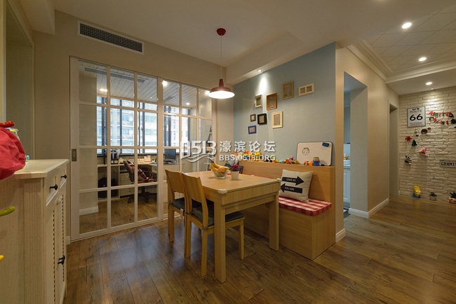 9 A4 { E$ F4 u/ P Y 设计师将餐厅设计的极为别致,一半是卡座,另一半是可扩充的小餐台和餐椅。顺实木色彩和客厅里的黄色彼此呼应,相得益彰,而浅蓝的墙色及照片墙运用,给餐厅又抹上轻松氛围。