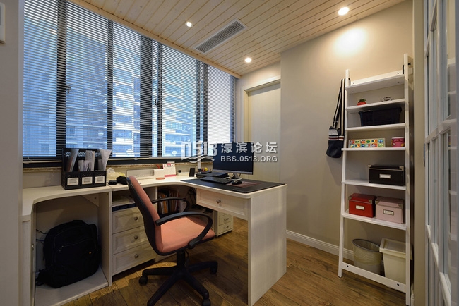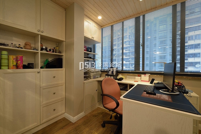 $ K: E2 G: {% Z# g 在家中很少会看到书房被布置的如此专业且商务,从中你不难发现主人中有一位是SOHO一族,巨大的玻璃窗加办公桌椅以及L型半围合工作台让这里看起来格外严谨,如果单从图片看,你很有可能会误以为这里是哪个企业主管的工作间。但专业的设计就会有专业的效率,当初主人对此间设计便是赞不绝口。 3 e2 a6 g' r( ~, N" Y! o5 q
