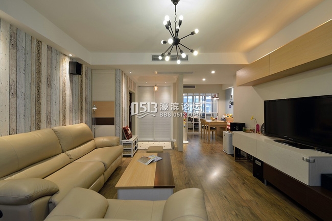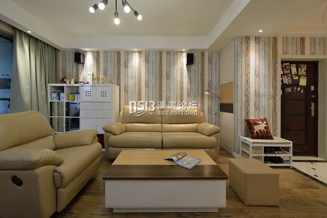 ; O* U) L! \! u% p' F: r 带有树皮肌理的墙纸从玄关一路延伸到客厅,带来属于森林的自然气息,大气又舒适的纯皮沙发透露主人懂得享受的性格。电视柜、橱柜茶几和小家具都选用黄+白为主色,优雅清淡,属于百看不腻的色系,而家中的氛围并不会随着主人年龄的增长显现端疑,值得一提的是,主人是一个音乐发烧友,家中藏有不少音响器材,而黄+白的色系会冲淡黑色器材所留下的压抑感。