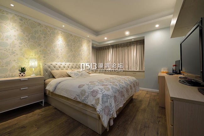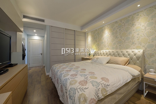 % p* i# a$ x' K 主卧一样色彩清淡,花枝缠绕的墙纸显示女主人浪漫的小心思,对于永远缺一件衣服,缺一个包包的女人来说,衣柜再大也会嫌小,也许只有这种超体量的步入式衣柜才能满足他们的收纳欲,如果还嫌储物不够,那就在飘窗上再定制一排抽屉吧。 ' F5 x4 Z1 b8 j