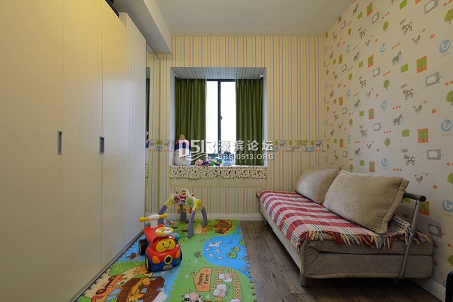 小小的儿童房里贴满色彩墙纸,小飘窗外加墨绿窗帘,带来童话故事里的缤纷想象。用沙发床替代普通的儿童床,节省了占地空间,白天有客人来访,这里可以暂且当娱乐室一用。