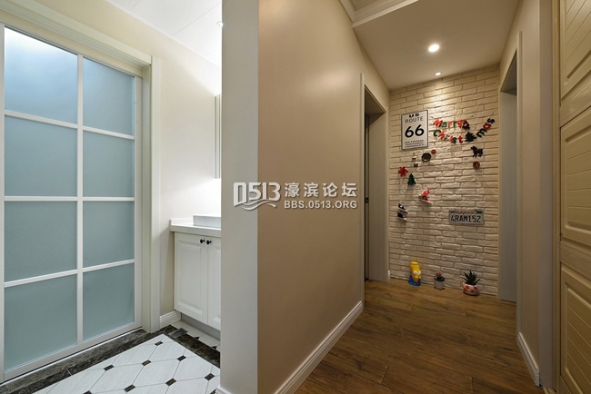 从入门处看到底是一片小小的装饰墙,设计师选用白色砖纹的墙纸可以打造出粗狂感,而上面吊着都是主人宝贝儿子的玩具还有夫妻二人带有记忆的小装饰,甚至还有两双平日穿的小鞋,这一切让这面墙看起来妙趣横生。浴室采用干湿分离,小小的白色盥洗台加上镜子,这样早晨洗漱时就不用为了争厕所而伤神了。