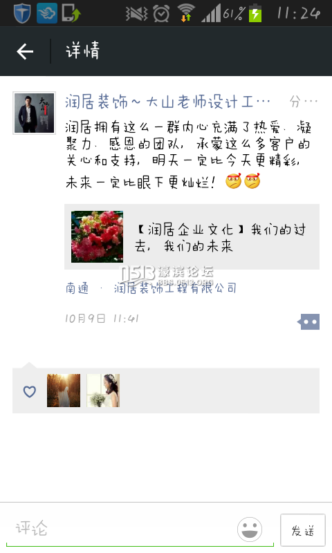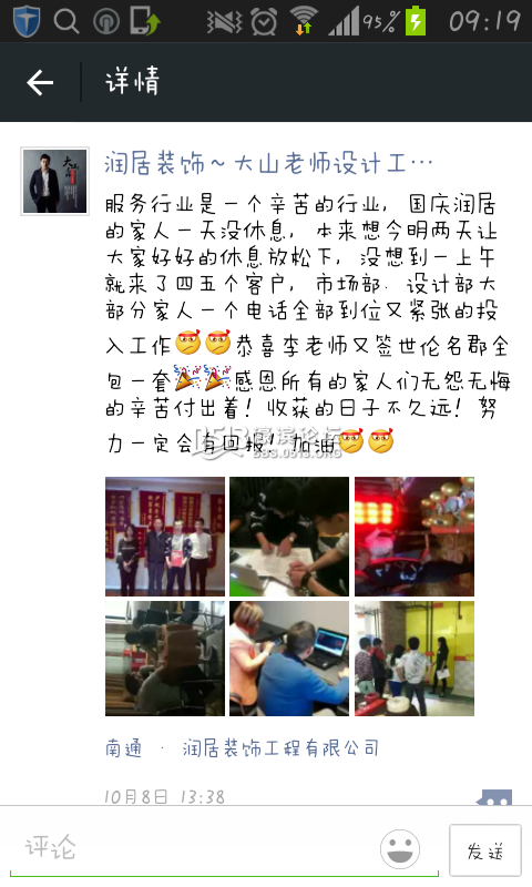 + }+ f+ @" e( {& S10月8号大山老师微信: 服务行业是一个辛苦的行业,国庆润居的家人一天没休息,本来想今明两天让大家好好的休息放松下,没想到一上午就来了四五个客户,市场部、设计部大部分家人一个电话全部到位,又紧张的投入工作,恭喜李老师又签世伦名郡全包一套,感恩所有的家人们无怨无悔的辛苦付出着!收获的日子不久远!努力一定会有回报!加油!!! & {1 t/ M3 K0 E D