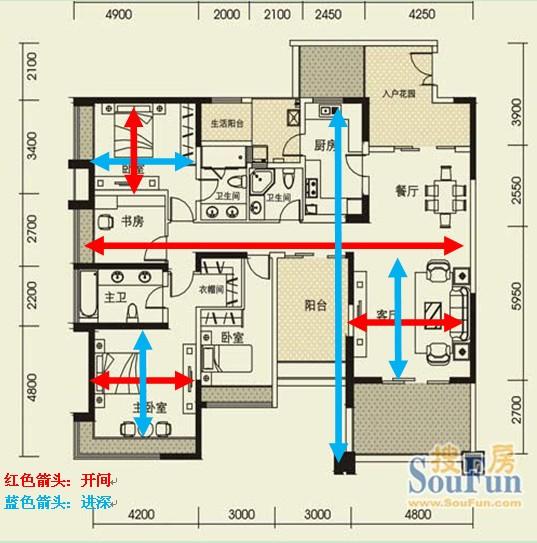 开间、进深:习惯上,我们把房间的主采光面成为开间(面宽),与其垂直的称为进深。也可根据房间门的朝向来确定开间和进深,房门进入的方向的距离为进深,左右两边距离为开间。根据《住宅建筑模数协调标准》(GBJ100-87)规定:住宅建筑的开间常采用下列参数:2.1米、2.4米、2.7米、3.0米、3.3米、3.6米、3.9米、 4.2米。(卧室以床顺着摆放的方向为开间,床头依靠的墙宽度为“进深”,卧室内布置床时,床头一般不靠窗台摆放) 3 C' O9 H, f, R7 F( T, k" N