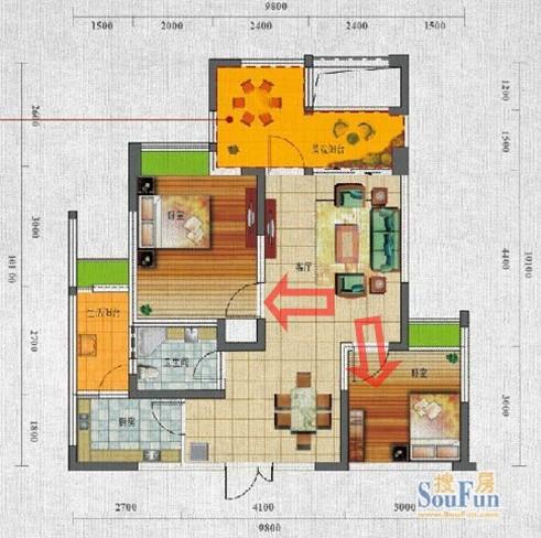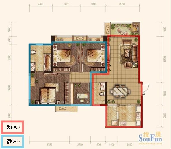 + @: Q, l* W; C( \; F* O动区:客厅、餐厅、厨房、次卫等。 静区:卧室、书房、主卫等。 动区是人们活动较为频繁的区域,应该靠近入户门设置,尤其是厨房;而静区主要供居住者休息,相对比较安静,应当尽量布置在户型内侧。两者分离,一方面使会客、娱乐或者进行家务的人能够放心活动,另一方面也不会过多打扰休息、学习的人,减少相互之间的干扰。详见以下范例: