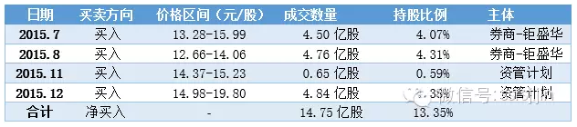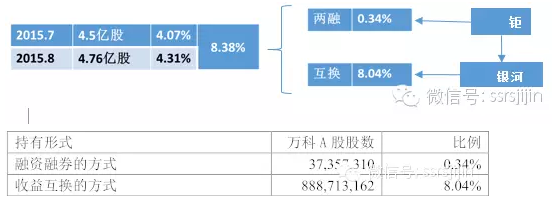 二、钜盛华买入过程 钜盛华买入历程相比前海人寿复杂的多。根据公告披露信息,乍一望去,一路高歌: 深究起来,缠绵悱恻。钜盛华买入万科的部分,分为三个阶段:A.7-8月收益互换+融资融券;B.10-11月大宗回购互换权益;C.资管产品买入。使用四种方法:融资融券,收益互换,大宗交易,分级资管(大约优先劣后1:2)。 第一阶段,2015年7-8月,钜盛华通过互换(两批)和两融买入,完成时,持股8.34%,持股结构如下。