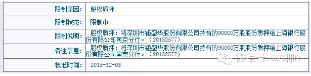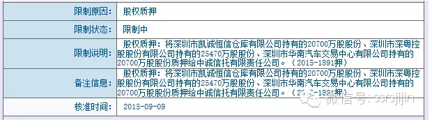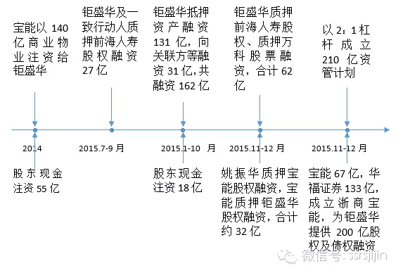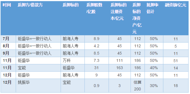 第三步:质押融资 通过资本投入和外部借款,钜盛华拿到了200多亿元现金,钜盛华把这个钱花到哪里去了呢?从2015年1-10月的现金流量表我们可以看到,钜盛华投资及其他与投资相关的活动支付的现金合计约180亿元。而从2015年10月31日的资产负债表我们可见: 首先钜盛华可供出售金融资产增加了83亿元,其中包含华侨城、中炬高新、南玻集团这三家股票价值约55亿元,另外27亿元可能是钜盛华已经交割的万科A股票市值。 其次,预付款增加了42亿,我们推测极大可能是是为参加韶能股份定增提前支付了认购款。 最后我们注意到2015年12月向其他股东收购了前海人寿股权,增持了31%。前海人寿净资产是112亿元,如果按照1.5倍PB进行转让的话,31%股权的转让款约为52亿。我们有一定把握去推测,钜盛华已经提前支付的前海人寿股权收购款。