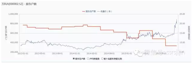 顺便提及一下,宝能在收集万科筹码的过程中,伴随着股东户数的急剧下降。今年年中时,股东户数是65万户,而到三季度股价还没大幅度飙升时,变成了33万户。最近那显然要更小了。早做功课,可以赚这笔宝能抬轿子的钱啊。