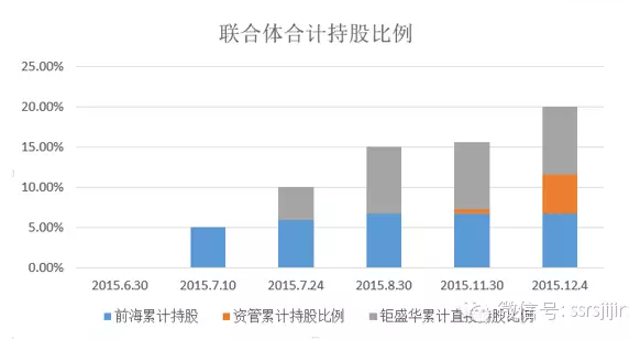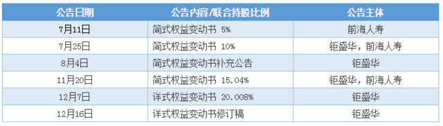 第三部分 宝能买买买! 钜盛华买入万科是通过两个实体分三步进行的。首先,钜盛华的一致行动人前海人寿通过二级市场买入万科,并于7月10日举牌。此后,再是钜盛华同月稍晚时出手,与前海人寿一同继续买入。钜盛华继续增持,前海人寿8月后未继续增持,并与前海人寿一起举牌。 前海人寿和钜盛华自7月起通过二级市场买入万科股票,自7月11日前海人寿第一次举牌,钜盛华/前海联合体共发布简式权益变动书公告4次(含一次补充公告),详式权益变动书有关公告2次(含一次修订稿):