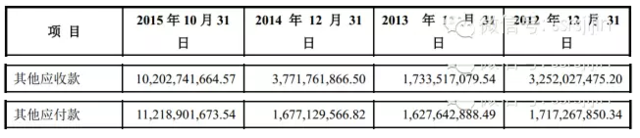 第二步:外部借款 宝能集团通过实物注资可谓是一举多得,一方面做大了钜盛华的资产,为其方便融资打下了伏笔。另一方面,自己不用掏现金出来。钜盛华拿了这个项目之后,将手中的投资性房地产连同前海人寿的股权,拿去找金融机构抵押借款,2015年10月31日长短期借款合计较2014年底增加了106亿元。 钜盛华除了找金融结构借钱,还找关联方借了不少钱。2015年10月末其他应付款飙升到112亿,增加了95亿。总的来看钜盛华找关联方或第三方融资了95亿,至于关联方或第三方怎会有能力给他提供31亿的现金呢?后面会提到这是靠抵押融资以及杠杆融资弄来的资金。