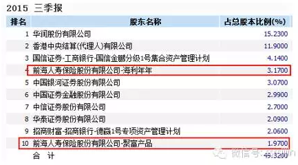 故考察万科三季报股东明细,即可大致看到前海人寿持有万科的最终状态(如下图)。前海是通过旗下保险产品买入的,进入前十大股东的两只产品合计持股6.14%,也就是说前海的持股主体都在这里了。