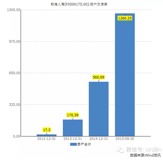 数据显示,万科是一个总资产规模接近6000亿的庞然大物,而且有1200亿净资产。这里宝能的数据是钜盛华,因为这个是宝能系重要的投融资平台,有非常多的资产,也是这次举牌万科的主力。而钜盛华下面,还有一块非常重要的资产:前海人寿。 前海人寿成立没几年,但是总资产增加特别快,到2015年9月30日,已经达到1260亿规模。 转播到腾讯微博