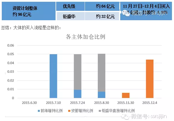 在此期间,随着大宗交易购回股份,万科于11月11日公告股东钜盛华质押7.3亿股万科A股。 第三阶段于11月27日开始,钜盛华通过三组资产管理计划买入股票合计4.97%,详情已经于12月16日权益变动书披露。修订版中进一步明确了资金来源,大约1:2的杠杆。