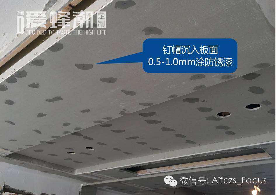小编有话说: 石膏板吊顶已安装完成,安装石膏板的自攻螺丝钉帽须沉入板面0.5-1.0mm,但不使纸面破损。钉帽涂防锈漆,腻子掺防锈漆补平(石膏板安装前,需核对灯孔与龙骨的位置,严禁灯孔与主、次龙骨位置重叠) K& _2 J0 g5 m( v5 z