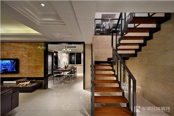 , ]& _% h+ J' C- A& V9 |( H% w! Y餐厅和厨房以时尚玻璃木条推拉门相隔,嵌入式茶镜酒柜在柔和的橘光衍射下影影绰绰,溢满温馨愉悦气息。长条形餐桌上新颖的小摆件更添几分现代情调。“U”型钢玻璃构架楼梯刚柔相济,苹果型灯饰流线垂布,似星星点点罩于其间。 ! b4 F, B8 V" E, V